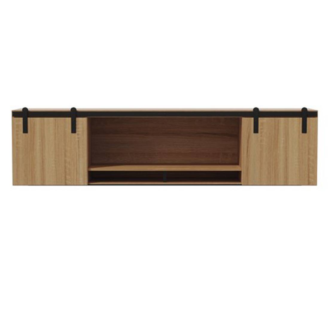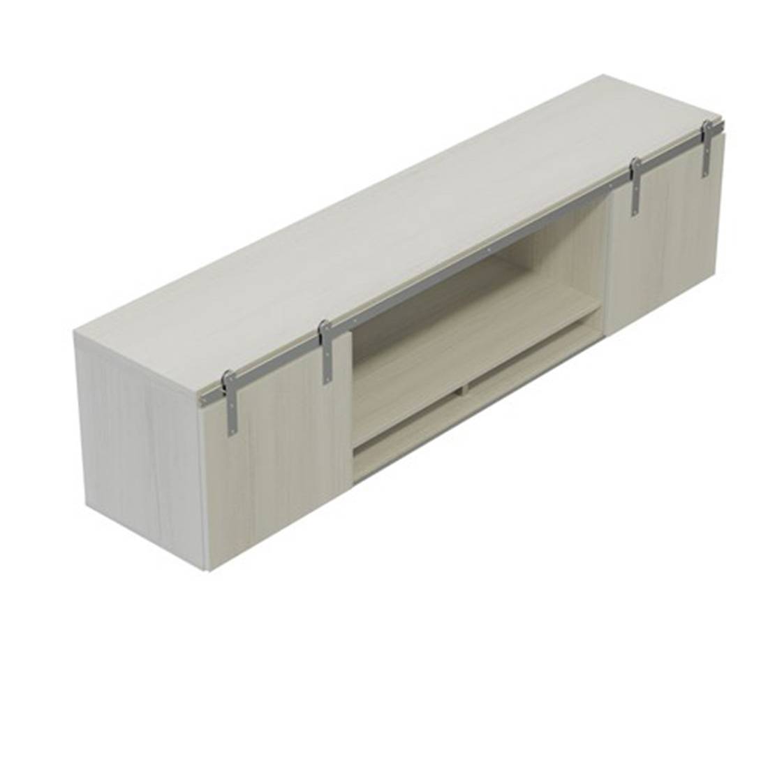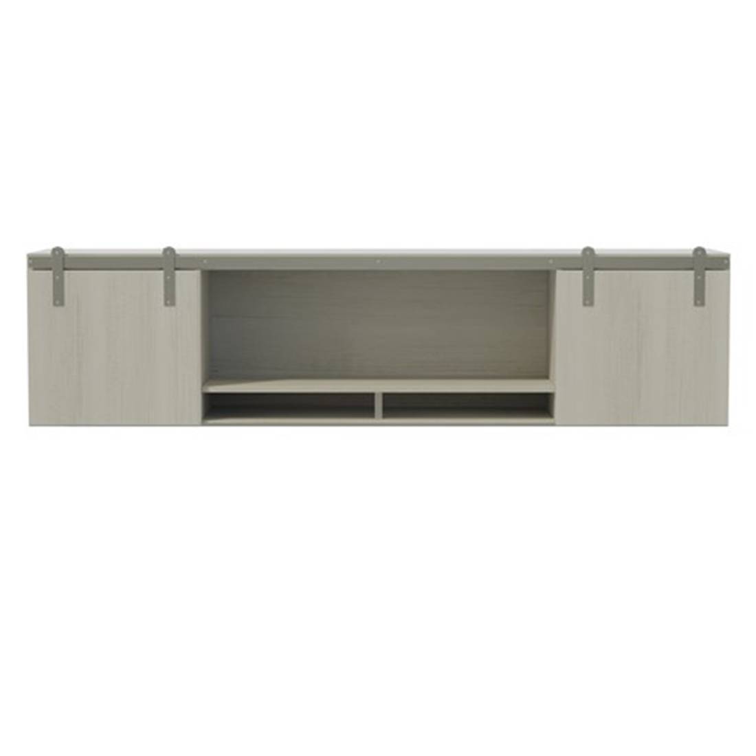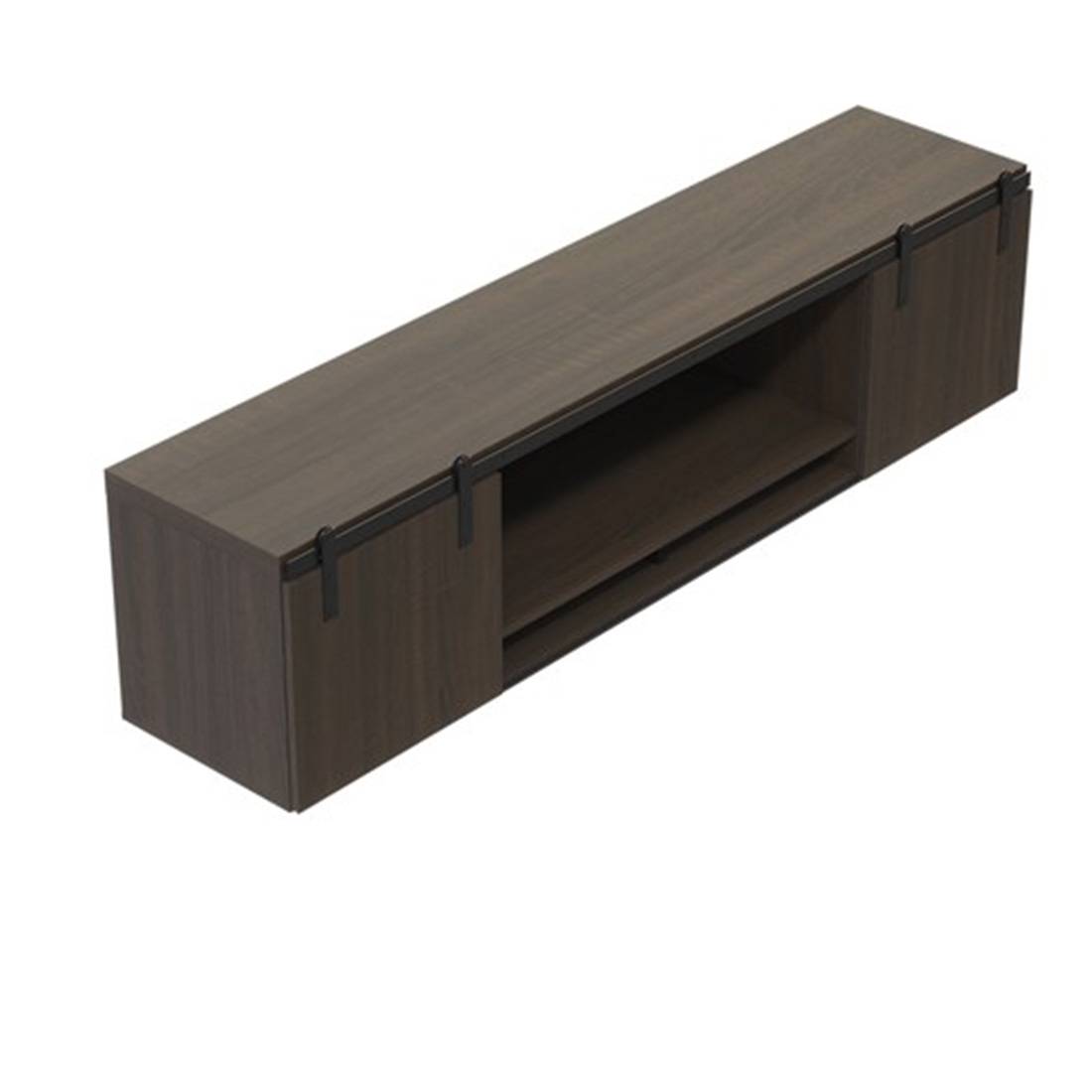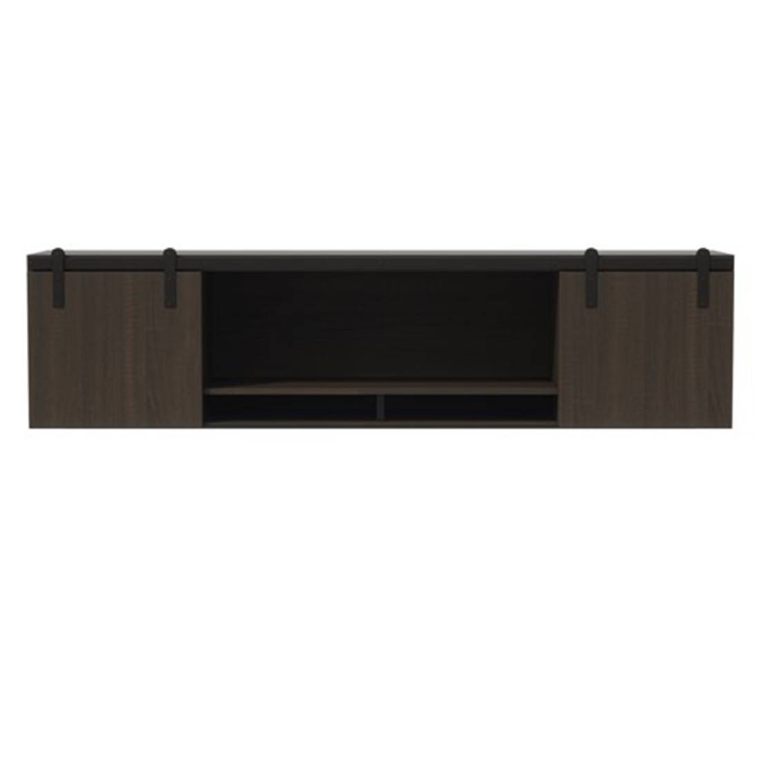 - Features wood doors with sliding, barn door hardware